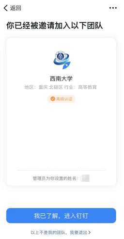 1. 未注册过“数智西大”或“钉钉”的用户注册成功后,会默认进入“西南大学”团队。