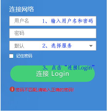 在登录页面,1、输入用户名和密码2、点击“连接Login”,即可登录校园网。