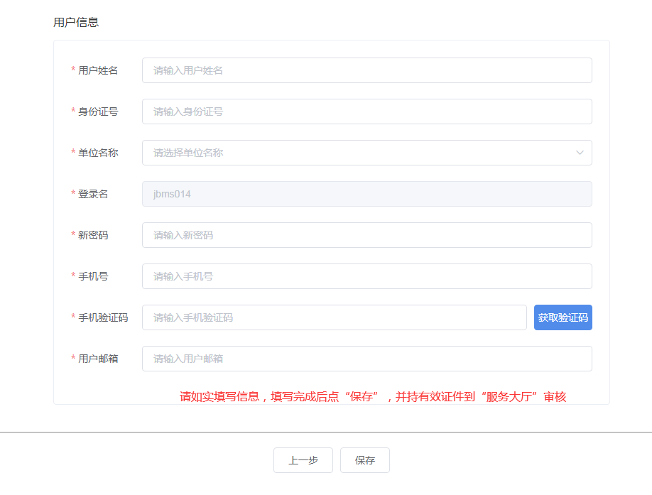 5、补充账号基本信息,点击“保存”,完成流程。本人持有效证件前往信息办服务前台,进行审核,待管理员审核通过之后,即完成了账号身份实名校验。