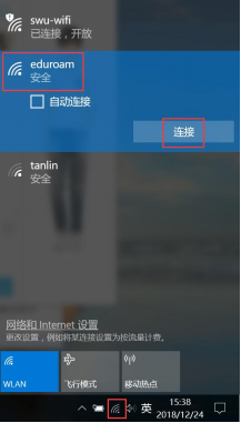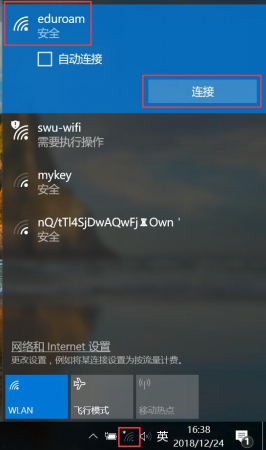 1、首先需要确保在eduroam信号覆盖范围内,然后点击右下角“无线图标”,选择“eduroam”,点击“连接”,如下图所示: