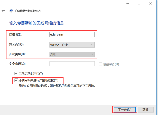 5、进入无线网络设置,网络名填“eduroam”,安全类型选择“WPA2-企业”,勾选“即使网络未进行广播也连接”,点击“下一步”,如下图所示: