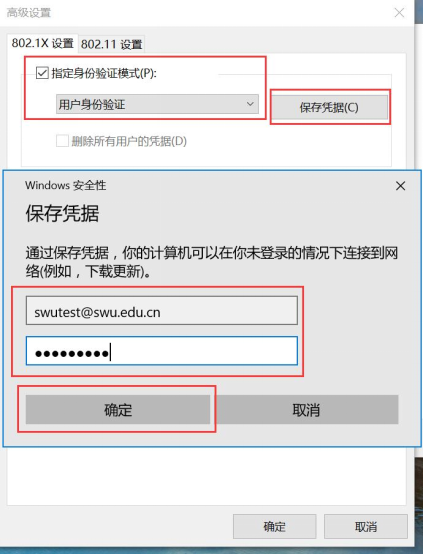 10、先勾选“指定身份验证模式”,然后下拉选择“用户身份验证”,然后点击“保存凭据”, 输入eduroam帐号和密码(西南大学师生出访时,eduroam账号为校园网账号@swu.edu.cn,密码为校园网账号的密码;访客来访时,其eduroam账号为其原机构账号@原机构所在域名,密码为其原机构账号的密码),然后点击确定,如下图所示: