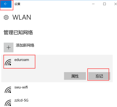 2、选择“eduroam”,选择“忘记”后点击左上角箭头图标返回,如下图所示: