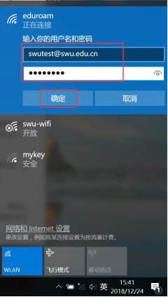 2、在自动弹出的输入框中,输入eduroam帐号和密码(西南大学师生出访时,eduroam账号为校园网账号@swu.edu.cn,密码为校园网账号的密码;访客来访时,其eduroam账号为其原机构账号@原机构所在域名,密码为其原机构账号的密码),然后点击“确定”。连接成功后,eduroam信号下会显示已连接的状态,如下图所示: