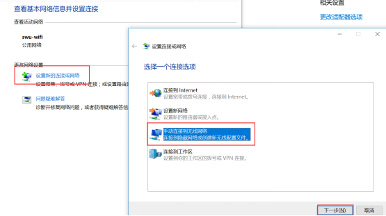 4、选择“设置新的连接或网络”,选择“手动连接到无线网络”,点击“下一步”,如下图所示: