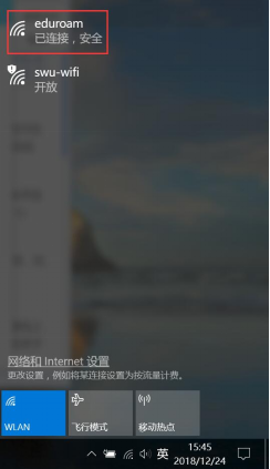 12. 点击右下角“无线图标”,选择“eduroam”,点击“连接”即可,如下图所示: