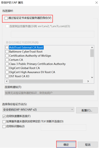 8、按下图核对设置,不勾选“通过验证证书来验证服务器的身份”,身份验证方法选择“安全密码(EAP-MSCHAP v2)”然后点击“确定”,如下图所示: