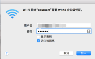 2、在弹出的登录框内,输入eduroam帐号和密码(西南大学师生出访时,eduroam账号为校园网账号@swu.edu.cn,密码为校园网账号的密码;访客来访时,其eduroam账号为其原机构账号@原机构所在域名,密码为其原机构账号的密码),点击“加入”。