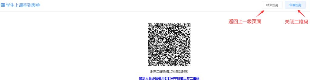 2.在课程列表中选择相应的进行签到的课程,点击“发起签到”,显示签到二维码,开启课堂签到。点击“暂停签到”后二维码关闭,点击“结束签到”后返回上一级页面(见附图2)。结束的签到可以在发起签到的页面通过“继续签到”返回。