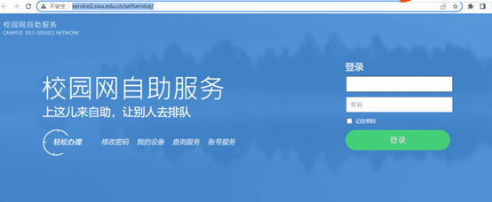 1、打开“校园网自助服务”网站(网址:http://service2.swu.edu.cn/selfservice/),输入校园网账号和密码登录。